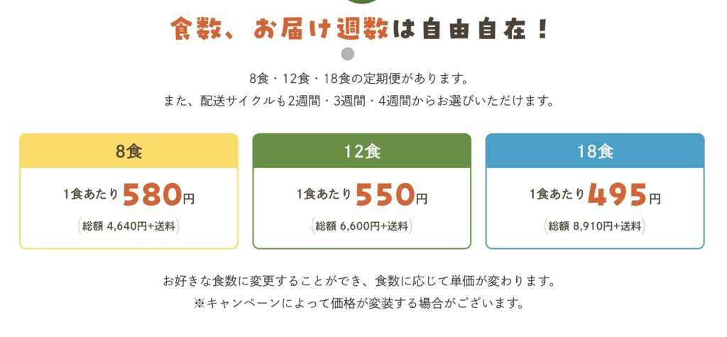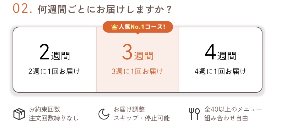 この流れにより、無理なく始められ、続けやすいサービス設計になっています。食数も8食・12食・18食と選べます。お届け周期も2週・3週・4週と選べて家庭ごとに調整しやすい。余っていたら次回のお届けはスキップできて溜まって困ることもないので安心して利用できます。